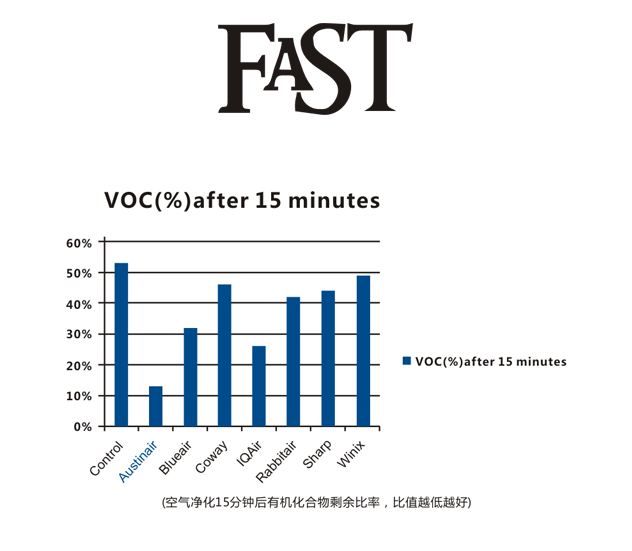 美國知名商業(yè)雜志《Fastcompany》聯(lián)合權(quán)威專家對(duì)多個(gè)知名品牌空氣凈化器進(jìn)行了測(cè)評(píng), 在《Buyer'sGuide: The best Air Purifier》(消費(fèi)者指引:最佳空氣凈化器推薦)文章中向消費(fèi)者推薦奧司汀空氣凈化器是去除氣味、甲醛、VOC等復(fù)雜化學(xué)氣體污染的最佳選擇。檢測(cè)中使用奧司汀健康伴侶標(biāo)準(zhǔn)型HM400與其它品牌在去除VOC(揮發(fā)性有機(jī)化學(xué)氣體)效率的PK中獲得完勝,15分鐘后VOC剩余率12%,遠(yuǎn)低于其它品牌機(jī)型。