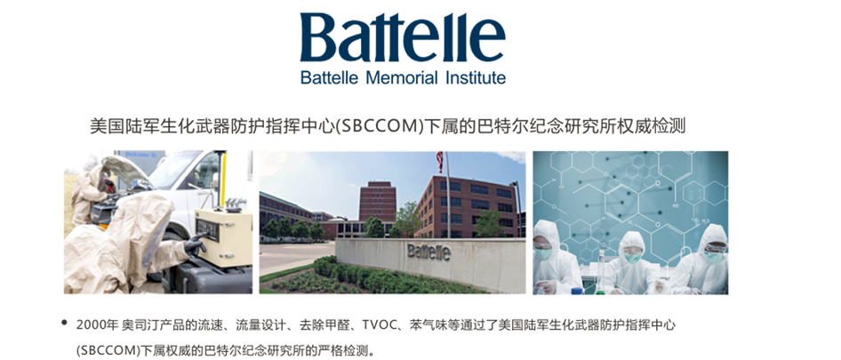 Battelle Memorial Institute紀(jì)念研究所)是總部設(shè)在美國俄亥俄州哥倫布市,在全球130個(gè)城市雇用了22000名科學(xué)家和研究人員,每年支配著高達(dá)65億美元的研發(fā)經(jīng)費(fèi)巴特爾美國的獨(dú)立研究機(jī)構(gòu),巴特爾紀(jì)念研究所是以科學(xué)、教育和慈善為目的設(shè)立的機(jī)構(gòu),在美國享受免稅待遇。奧司汀空氣凈化器通過巴特爾紀(jì)念研究所嚴(yán)格檢測(cè)。